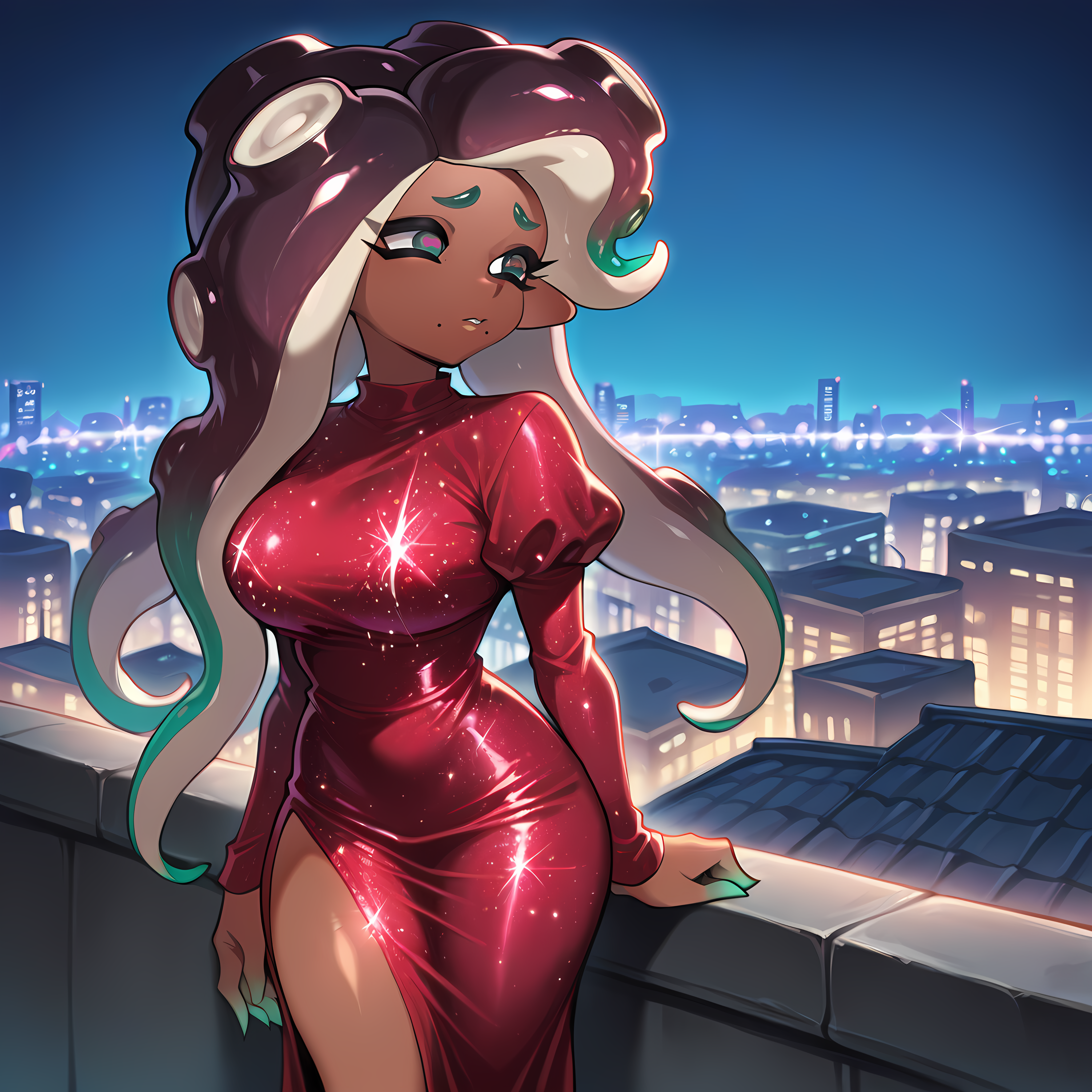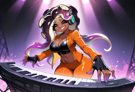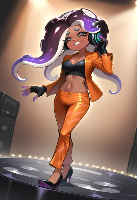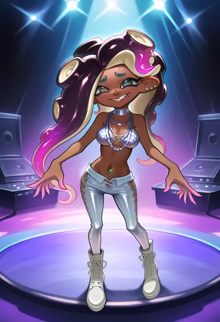 グランドフェスティバル アウトフィット: m4r1Gr4nd, marina \(splatoon\), 暗い肌の女性、グラデーション肌、触手のような髪、長い髪、ピンクの髪、紫の髪、多色の髪、ツートーン髪、グラデーション髪、頭足類の目、ピンクの瞳、緑の目、口の下のほくろ、肩出し、腹部露出、おへそピアス、シルバーのビキニトップ、白いクロスレースパンツ、スリットパンツ、シルバーのチョーカー、白いブーツ、ネックレス、耳ピアス、ジュエリー