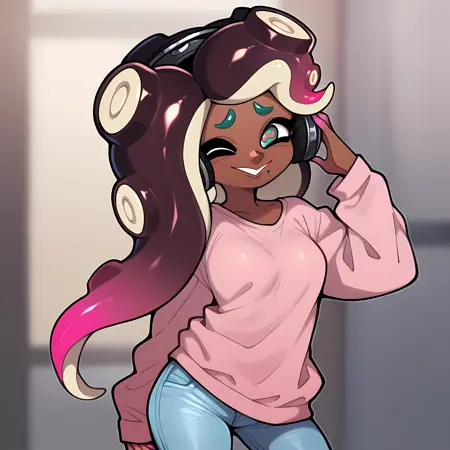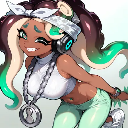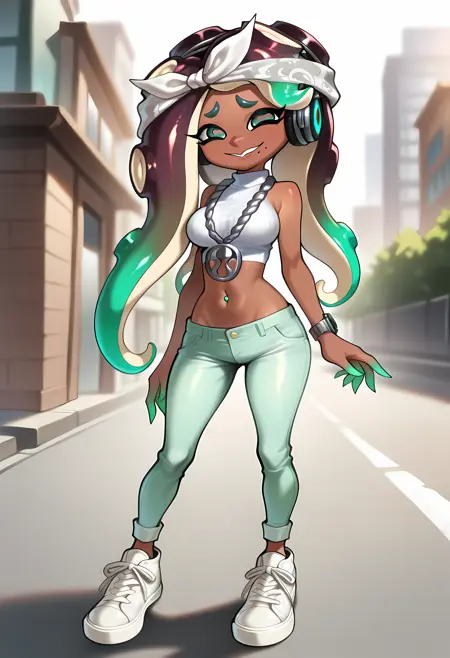オクト・エクスパンション アウトフィット(DJハイパーフレッシュ): m4r10ct0, marina \(splatoon\), オクタリアン、暗い肌の女性、グラデーション肌、触手のような髪、長い髪、茶色の髪、多色の髪、グラデーション髪、緑の髪、ツートーン髪、触手のような髪、頭足類の目、ピンクの瞳、緑の目、口の下のほくろ、肩出し、腹部露出、おへそピアス、白いシャツ、ノースリーブのタートルネック、ノースリーブシャツ、緑のズボン、ローレグズボン、靴、白いスニーカー、ヘッドフォン、白いバンダナ、時計、ジュエリー、メダリオンチェーンネックレス