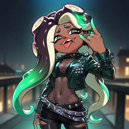 スプラトゥーン2 アウトフィット(オフ・ザ・フック): m4r1D3f, marina \(splatoon\), オクタリアン、暗い肌の女性、グラデーション肌、触手のような髪、緑の髪、グラデーション髪、頭足類の目、ピンクの瞳、口の下のほくろ、腹部露出、ショートベスト、襟付きベスト、キャミソール、ヘッドフォン、指なし手袋、黒いブーツ、黒いショートパンツ、緑のタイツ、ショートパンツの下のタイツ、おへそピアス、ジッパーの取り付け部