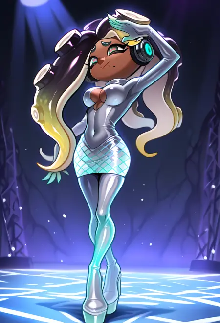 ファイナルフェスト アウトフィット(チームオーダー): m4r10rd3r, marina \(splatoon\), オクタリアン、暗い肌の女性、グラデーション肌、触手のような髪、長い髪、黒髪、金髪、多色の髪、頭足類の目、ピンクの瞳、口の下のほくろ、ラテックス、肌にぴったり、シルバーのボディスーツ、模様入りのペンシルスカート、服のカットアウト、胸元のカットアウト、ツヤツヤの服、プラットフォームヒール、ヘッドフォン
