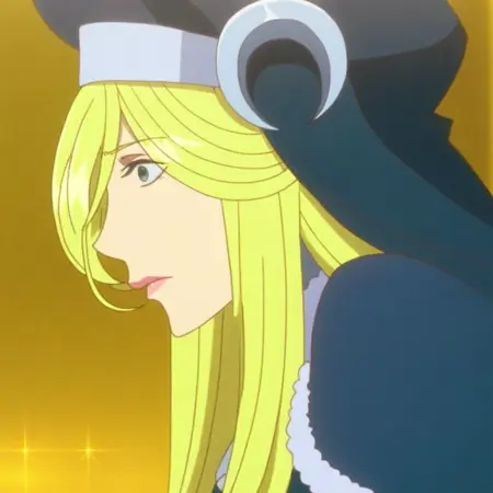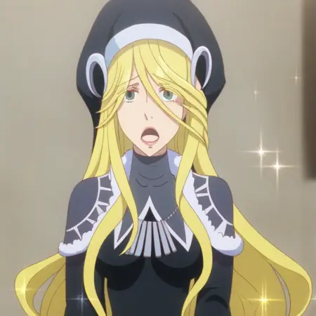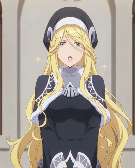 Marlefiss, blonde hair, long hair, very long hair, blue-green eyes, 1girl, solo, open mouth, nun, habit, hat, dress, sparkle, black headwear, black dress