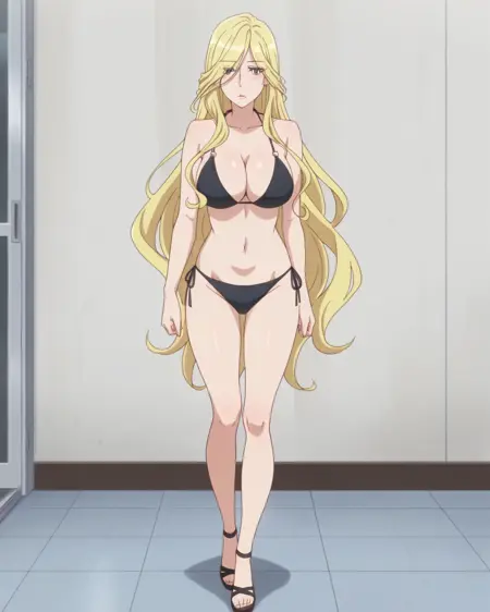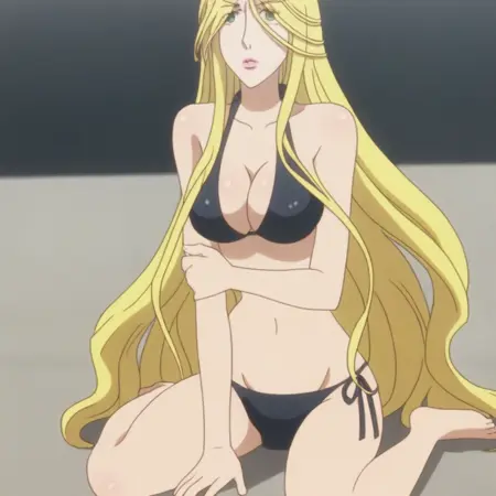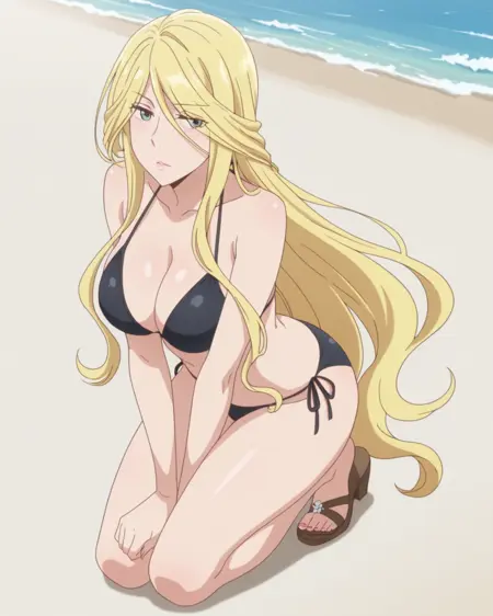 Marlefiss, blonde hair, long hair, very long hair, blue-green eyes, 1girl, solo, black bikini, cleavage, side-tie bikini bottom, ribbon, full body