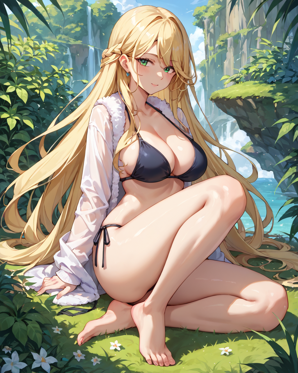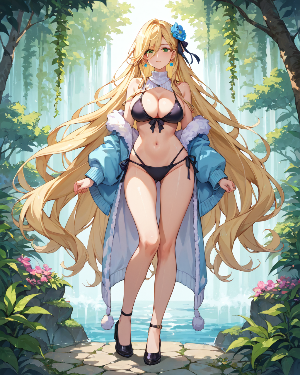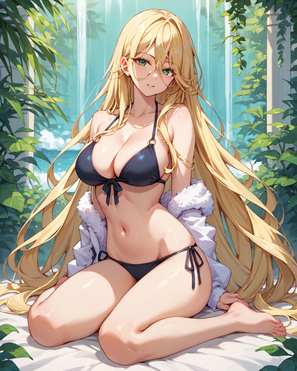 Marlefiss、金髪、長い髪、非常に長い髪、青緑色の目、1girl、ソロ、ブラックビキニ、胸元、サイドタイ式ビキニパンツ、リボン、全身