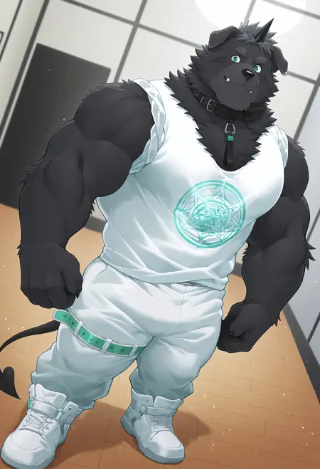 dog, black fur, two-tone fur, single horn, green eyes, facial mark, fangs, chest tuft, chest markings, animal ears, dog ears, animal ear piercing, demon tail, claws, muscular male