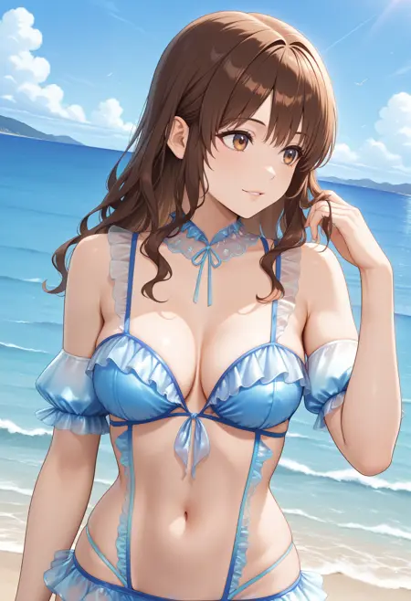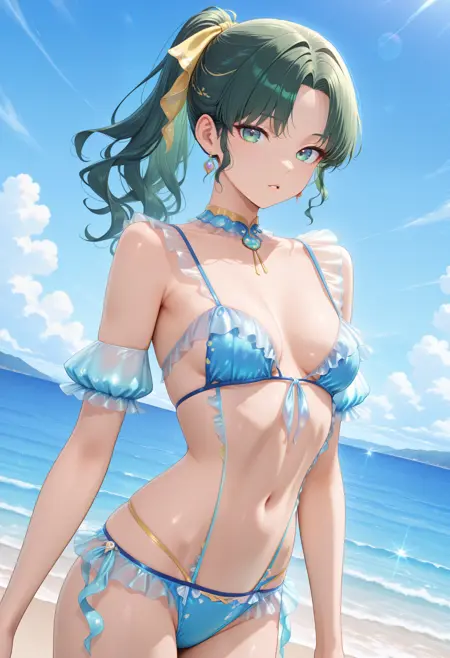 基本プロンプト:NamiuchiMarine,detached collar,frilly blue bikini,sheer frilled fabric,detached frilly sleeves,high-cut frilly bikini bottom,yellow accents,lace-like trim,ankle ribbon sandals