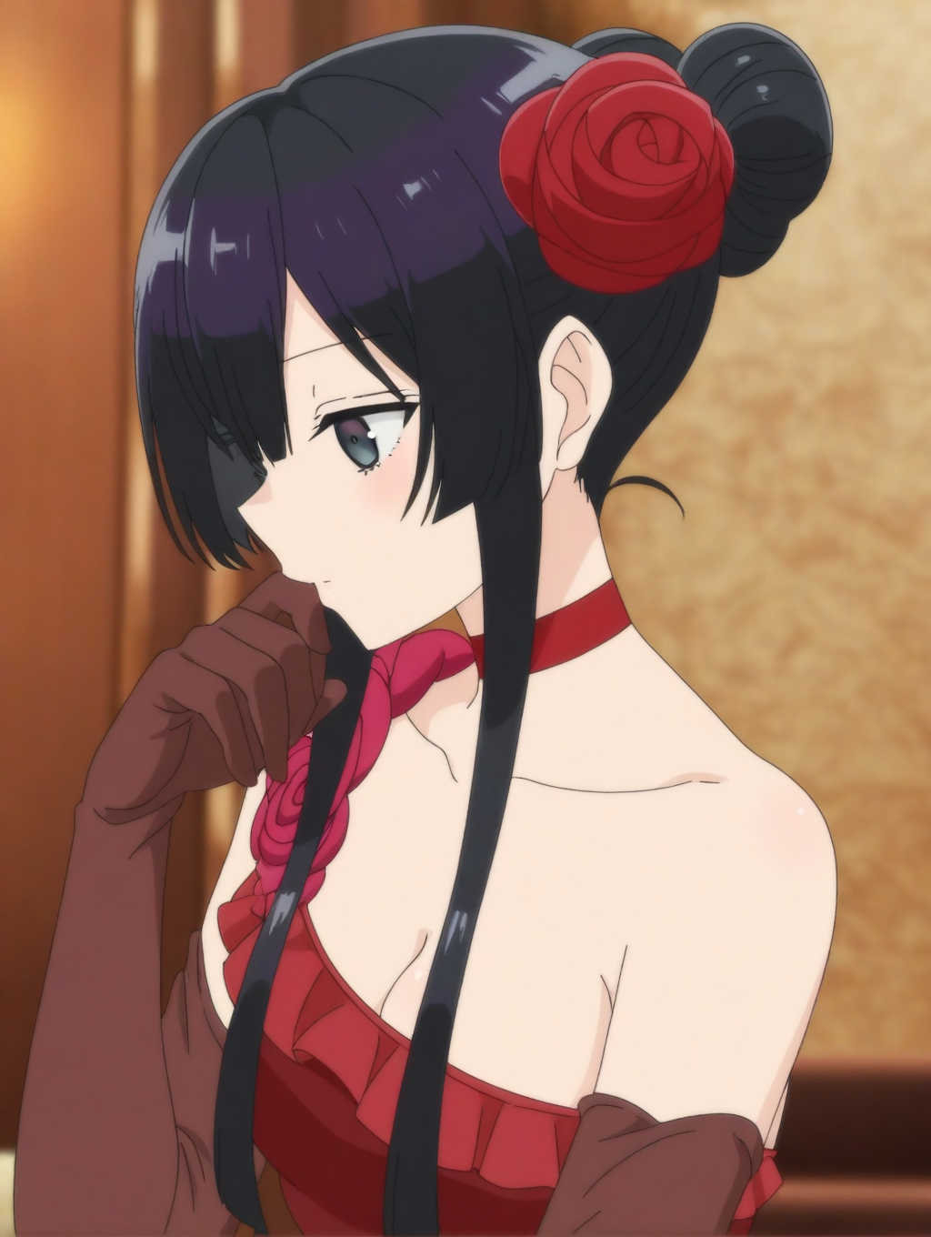 lora:YumiellaDolkness-ILXL-v1:1,YumiellaDolkness,black_hair,long_hair,black_eyes,red_formal_dress,sidelock,chignon,red_rose,cleavage,brown_glove,red_choker,
