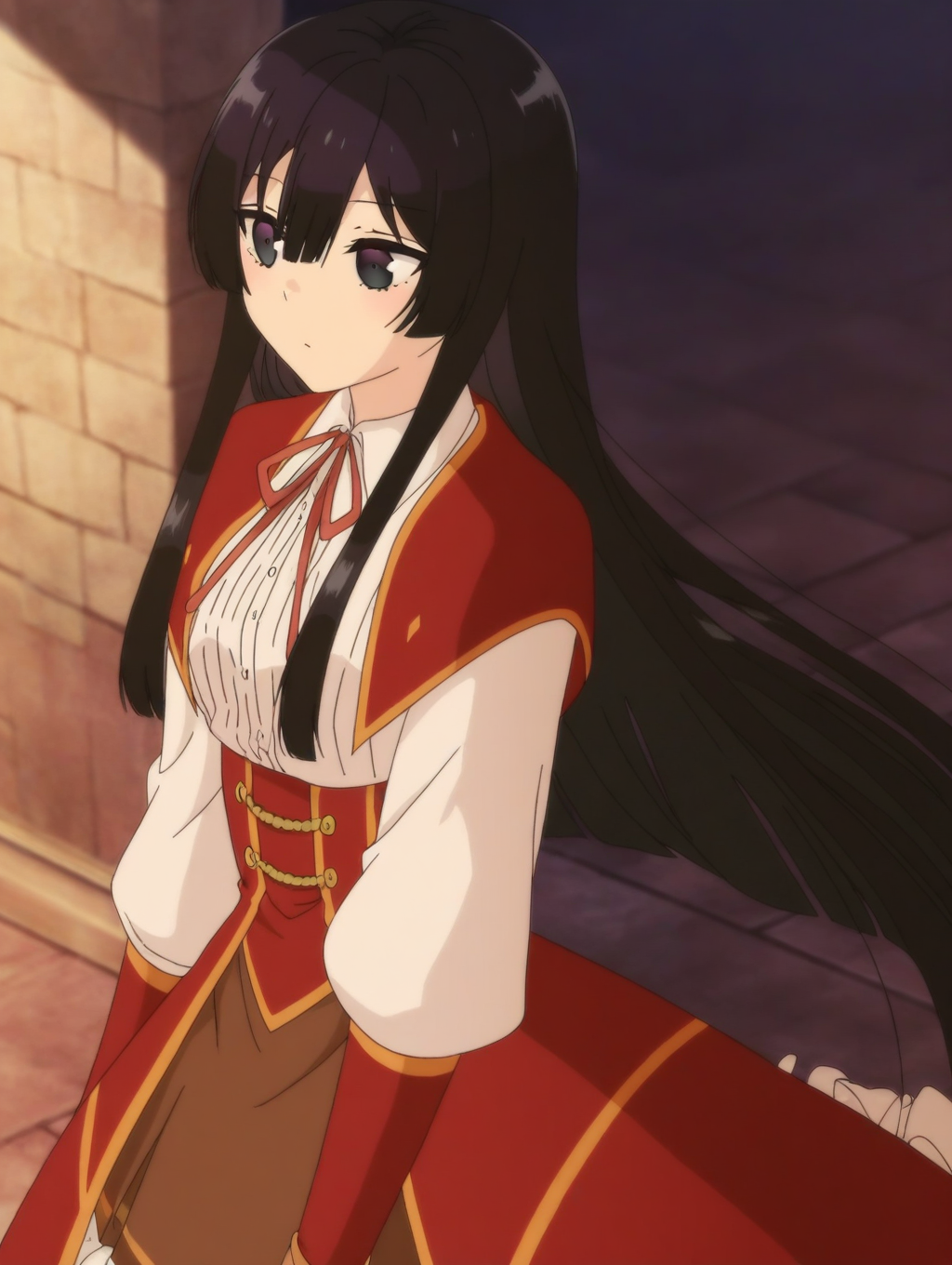 lora:YumiellaDolkness-ILXL-v1:1,YumiellaDolkness,black_hair,long_hair,black_eyes,straight_hair,white_blouse,ribbontie,red_skirt,layered_skirt,red_cape,