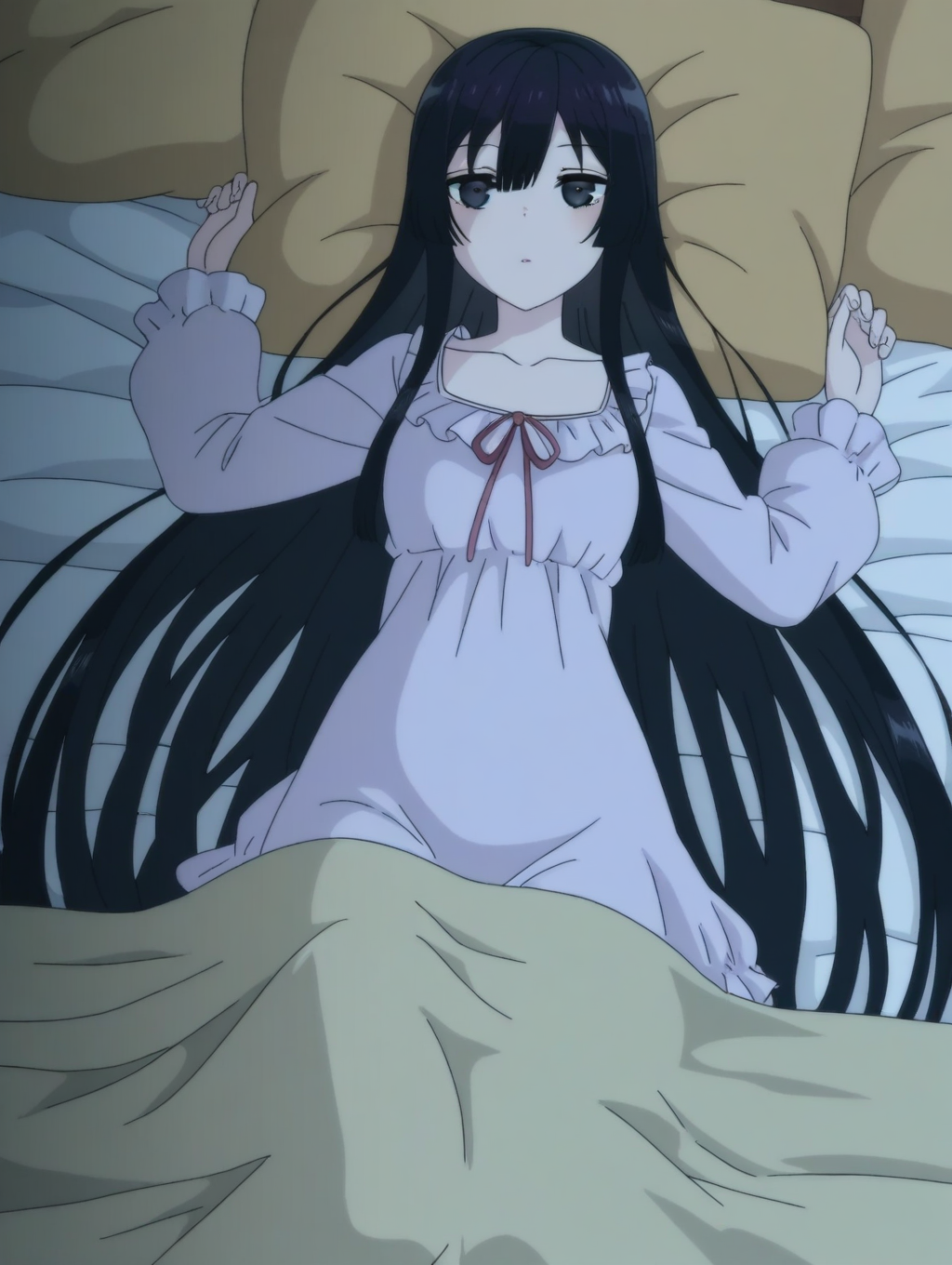 lora:YumiellaDolkness-ILXL-v1:1,YumiellaDolkness,black_hair,long_hair,black_eyes,straight_hair,negligee,on_bed,