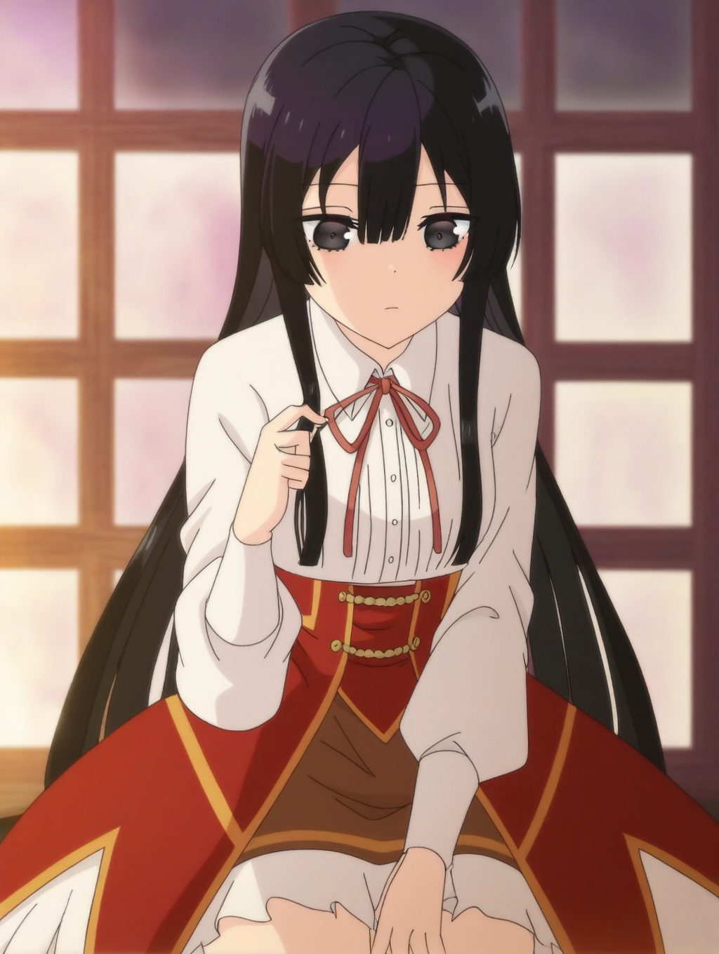 lora:YumiellaDolkness-ILXL-v1:1,YumiellaDolkness,black_hair,long_hair,black_eyes,straight_hair,white_blouse,ribbontie,red_skirt,layered_skirt,