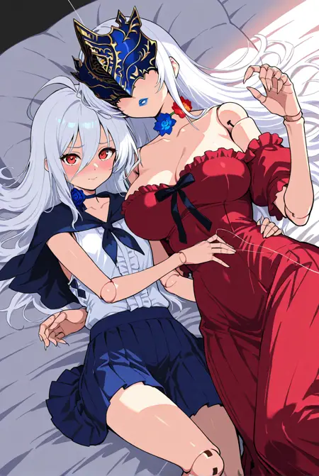 silver / grey / white hair , blue lips , mask , covered eyes , red dress , strapless , off shoulders , puffy sleeves , ( long sleeves ) , detached collar , claws