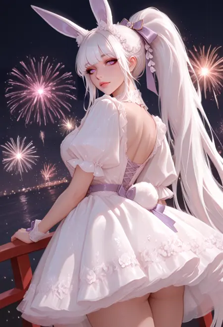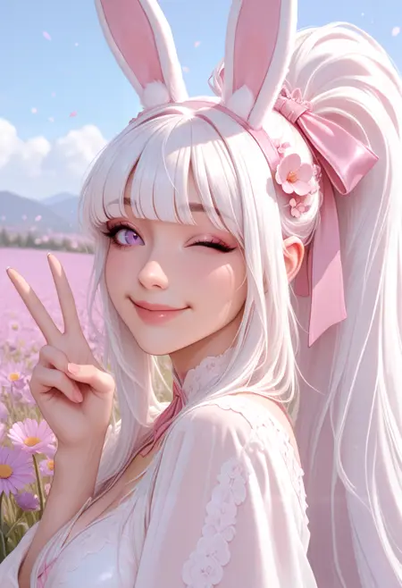 OCBnyGrl, 1girl, animal ears, long hair, white hair, high ponytail, purple eyes, hair ribbon, bunny ears, hair ornament, blunt bangs