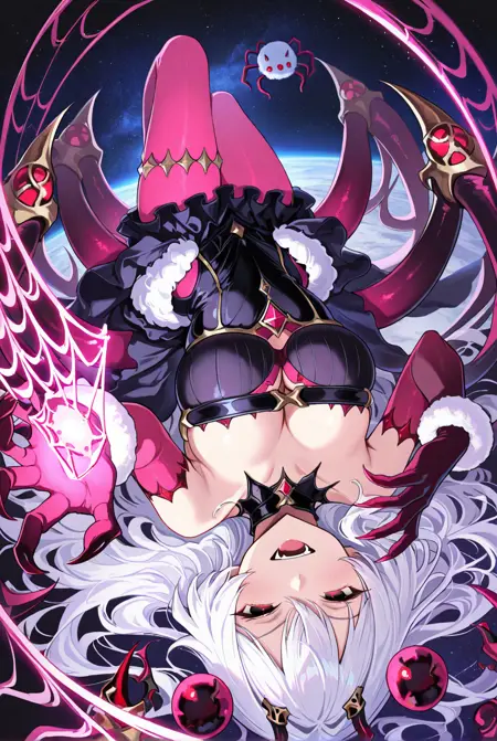 默认服装:分离式领口,无肩带连衣裙,胸带,黑色连衣裙,服装剪裁,金色镶边,(粉色)肘部手套,毛皮镶边(腕带),(粉色)连裤袜,荷叶边;
