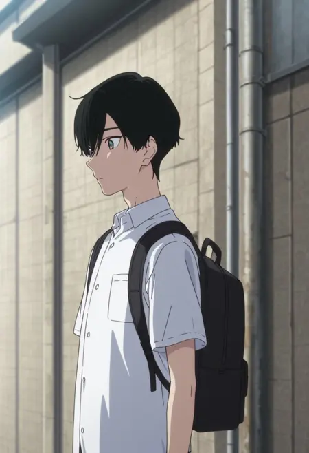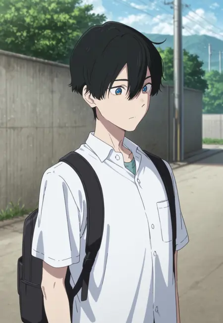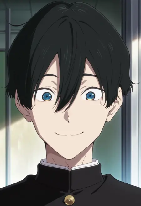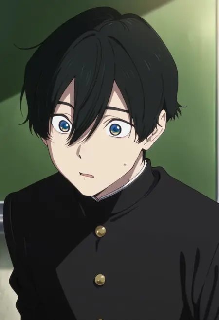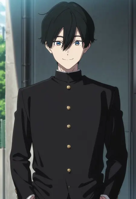 1boy, male focus, solo, blue eyes, black hair, school uniform, gakuran, black jacket, black pants, shoes, black footwear,