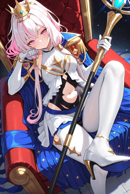 - 王冠/ティアラ、エギュイレット、勲章、金縁、青いマント、白いシャツ、ノースリーブ、黒いボディスーツ(下着)、(白い)肘手袋、衣装のカットアウト、サイドカットアウト、お腹のカットアウト、(白/青)ミニスカート、青いリボン、星形の装飾、白いパントイーズ、太ももカットアウト、(白い靴);