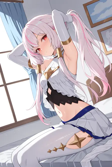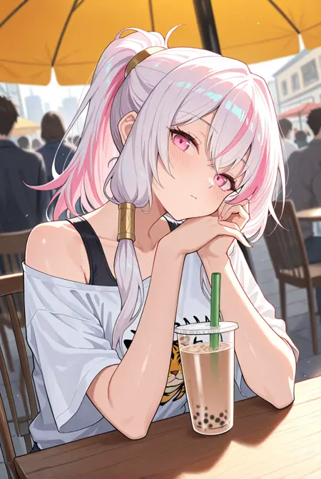 - 白髪、ピンク髪、多色髪、低ツインテール、ポニーテール、ピンクの目;