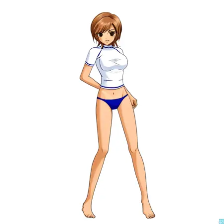 水着:(逸茂げんき、THE ギャル麻雀、T-GAL-M、T-GAL-M_逸茂げんき、茶色の目、茶色の髪、短い髪、日焼け、日焼けライン、大きな胸、へそ、水着、ビキニ、シャツ、白と青の水着、白い短袖シャツ、首元、カーディガン、お腹、ぴったりしたシャツ、青いトリム、青いビキニ下着、ビキニ下着)