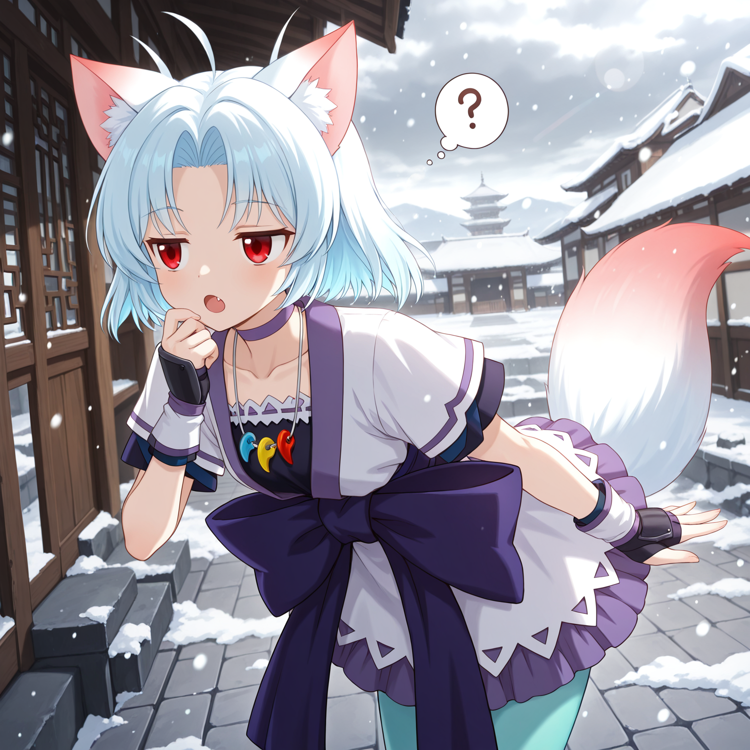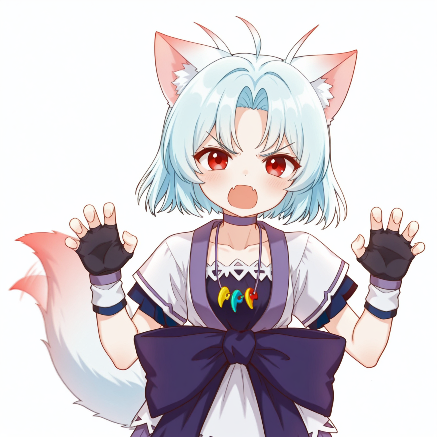 qiqiaohanli, ライトブルーの髪, 短髪, 三本のアホ毛, 白いグラデーションのキツネの耳, 耳のふわふわ毛, セパレートの前髪, 赤い目, 環玉ネックレス, 紫のチョーカー, 鎖骨, 白いベスト, 紫のラペル, レース縁取りのストラップレス下着, 短い袖, 重ねた袖, プリント入り袖, フィンガーレスグローブ, 濃い青のサッシュ, 腰のリボン, 白いギザギザスカート, 紫のフリル付きペチコート, 白いグラデーションのキツネの尾, アクア色のパンティストッキング, 青いアンクルブーツ,