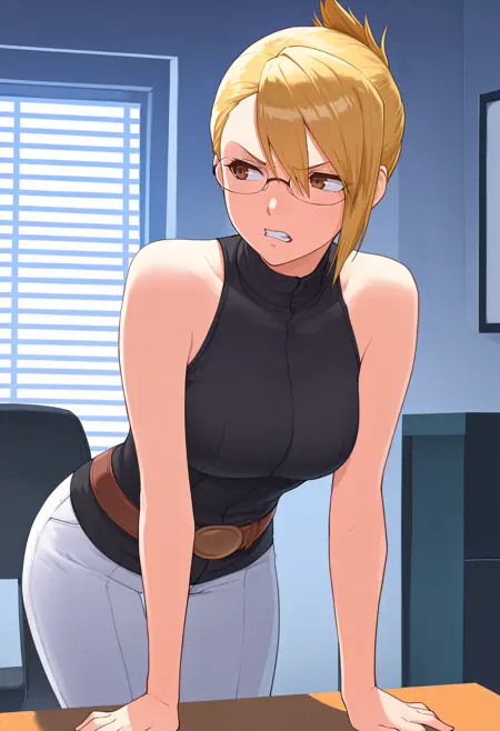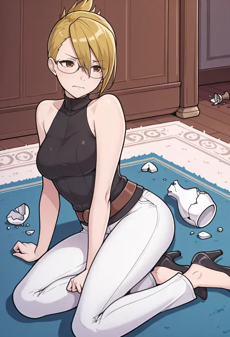 Trials & Tribulations appearance: blonde hair, short hair, folded ponytail, asymmetrical bangs, brown eyes, glasses, sleeveless shirt, black shirt, turtleneck, brown belt, white pants