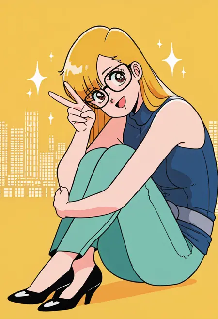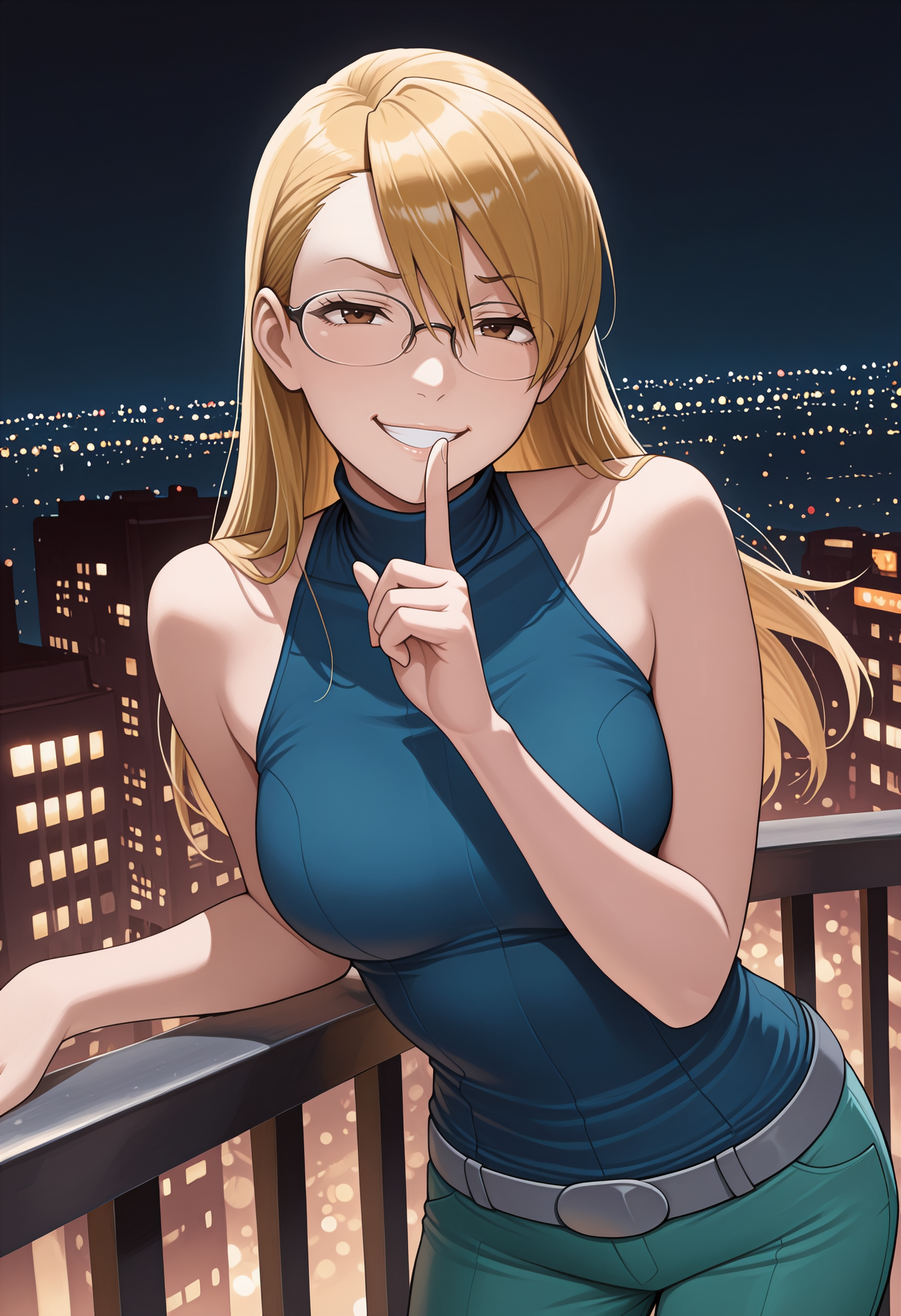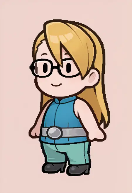 Justice for All appearance: blonde hair, long hair, asymmetrical bangs, brown eyes, glasses, sleeveless shirt, blue shirt, turtleneck, grey belt, teal pants