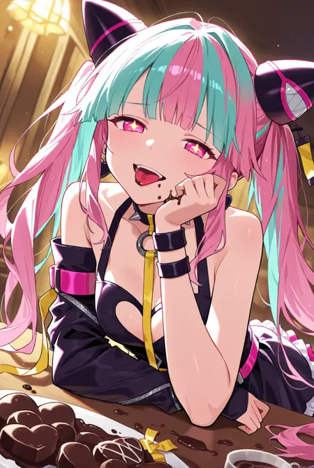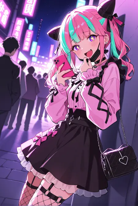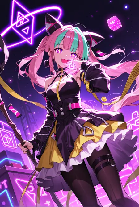 デフォルトの衣装:ハーネック、Oリング、肩出し、黒いドレス、衣装のカットアウト、胸元のカットアウト、(黄色)リボン、片袖/不対称な袖、取り外し可能な袖、(ジッパーが開いた袖)、ベルト、スパイク、レイヤードスカート、ピンクのスカート、黒いタイツ、太ももストラップ;