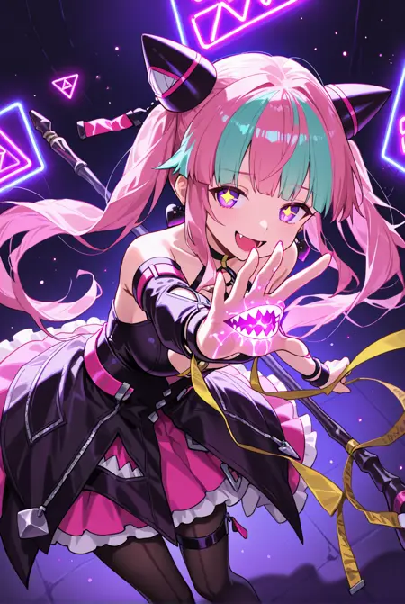 ピンクの髪、アクア色の髪、マルチカラーの髪、ツインテール、紫の目、(きらめく目);