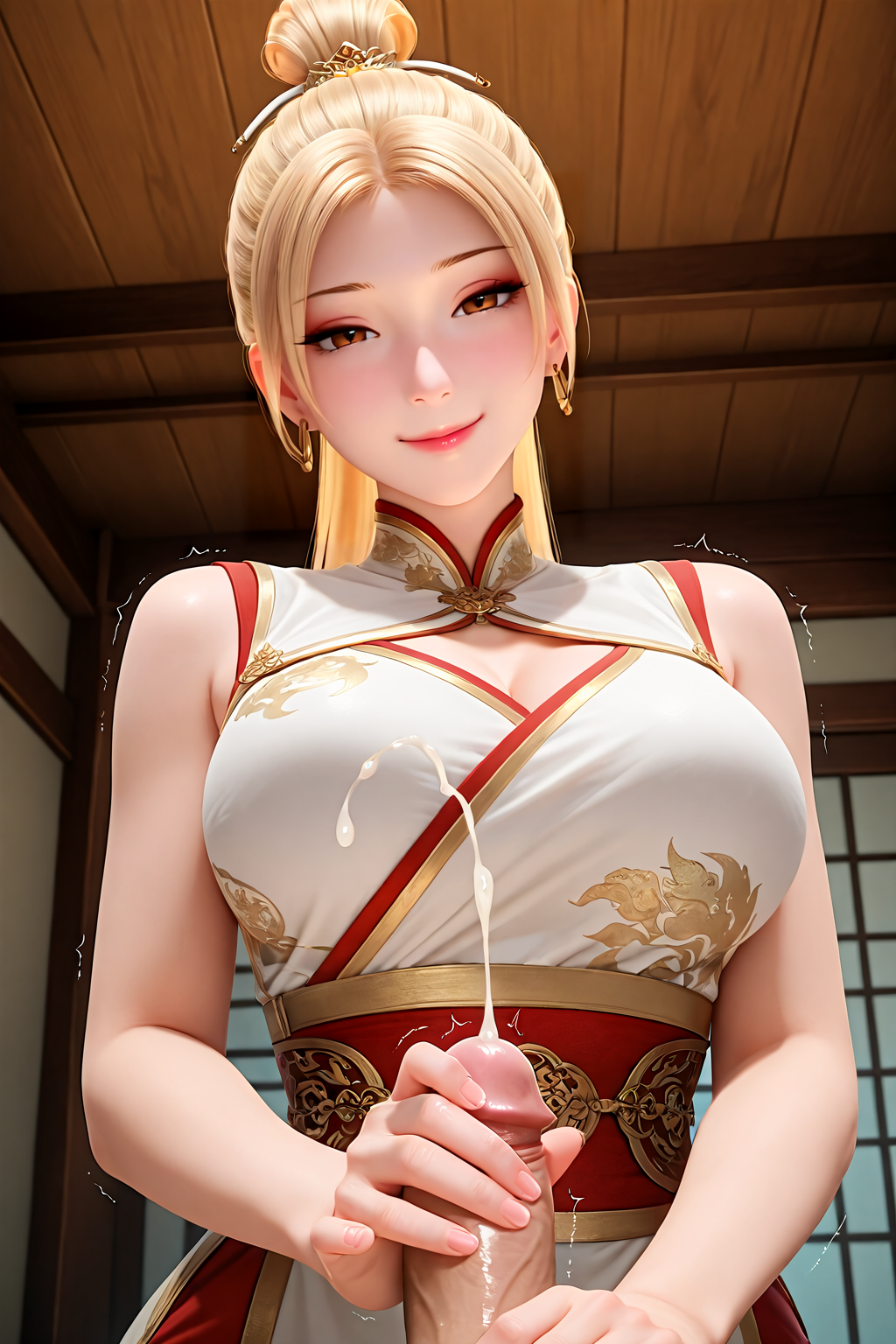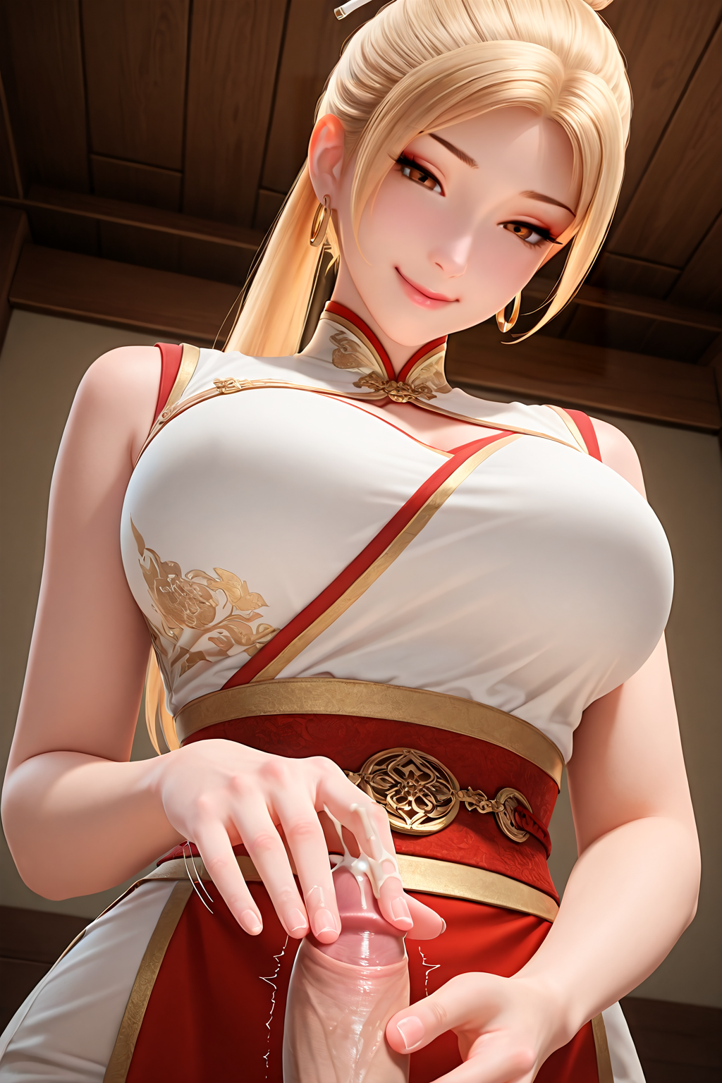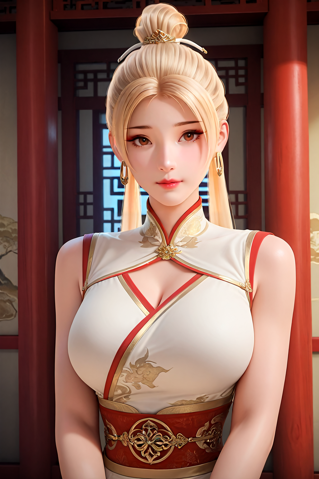 xiao ning'er, brown eyes, long hair, blonde hair, hair bun, ponytail, earrings, jewelry, chinese clothes
