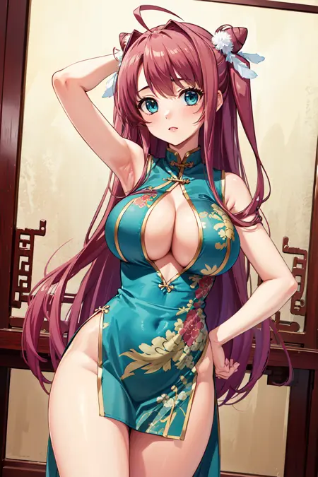 - ryuubi,long hair,ahoge,cone hair bun,hair ornament,shirt,detached sleeves,skirt,thighhighs,thigh boots
