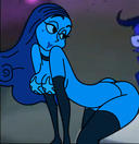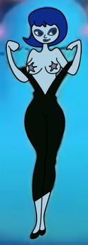 어머니-파란색 머리카락, 짧은 머리, 파란색 피부, 곡선형 몸매, 긴 다리, 검은색 피쉬넷 스타킹, 검은색 브라, 어두운 팔꿈치 장갑, 하이힐, 파란색 귀걸이, 파란색 리본
