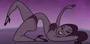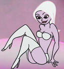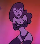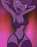 제시카-짙은 보라색 머리카락, 짧은 머리, 보라색 피부, 곡선형 몸매, 긴 다리, 보라색 브라, 보라색 팬티, 보라색 스타킹, 초커, 귀걸이