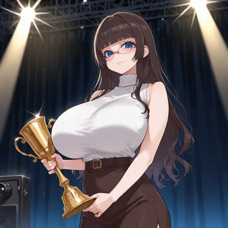 캐릭터: 1girl, 긴 머리, 둔한 앞머리, 나무 갈색 머리, 파란 눈, 안경, 거대한 가슴, 유방 효모,