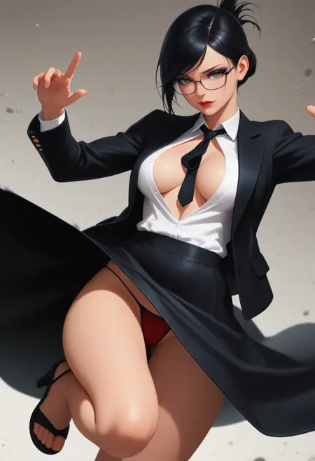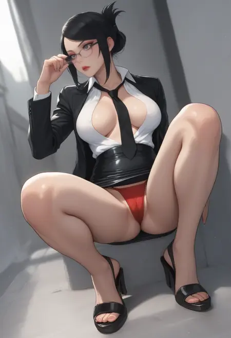 black latex suit, business suit with long skirt, slit in the skirt, red panties, g-string panties, cameltoe, formal clothing, black jacket, black tie, white shirt, open shirt, no bra, bare legs, average breasts, black hair, folded ponytail, swept bangs, gray eyes, glasses, high heel sandals, eyeshadow, lipstick