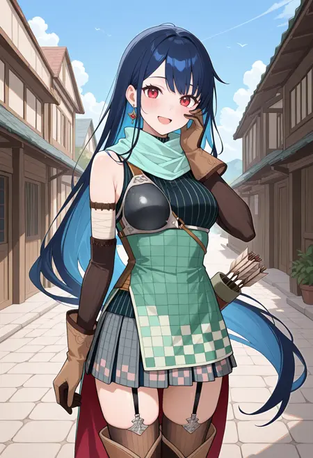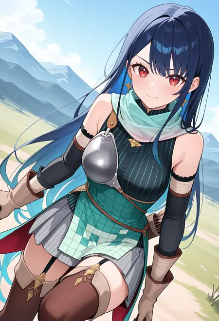 • atlidef, aqua scarf, gradient scarf, jewelry, sleeveless shirt, black shirt, grey muneate, armor, pinstripe shirt, green dress, square print, tile print, checkered dress, grey skirt, pleated skirt, high-low skirt, two-tone skirt, two-sided fabric, detached sleeves, gloves, detached sleeves, bandaged arm, black sleeves, black garter straps, brown thighhighs, black thighhighs,