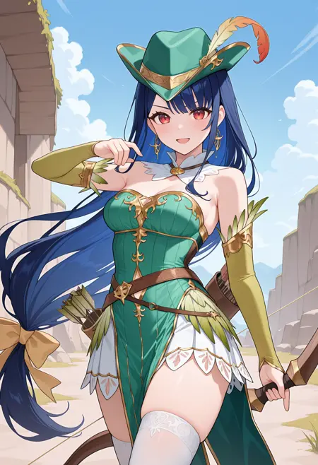 • atlibrv, low-tied long hair, bicorne, hat feather, green hat, detached collar, white collar, strapless dress, green dress, gold trim, feather trim, detached sleeves, green sleeves, pelvic curtain, white skirt, belt, white thighhighs,