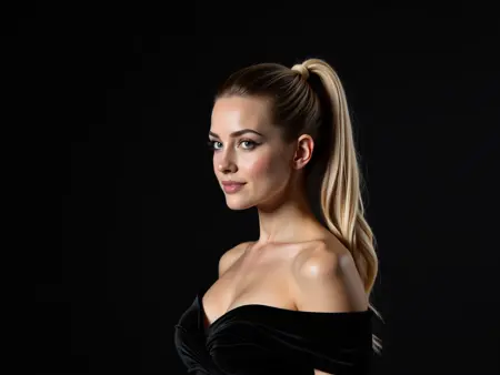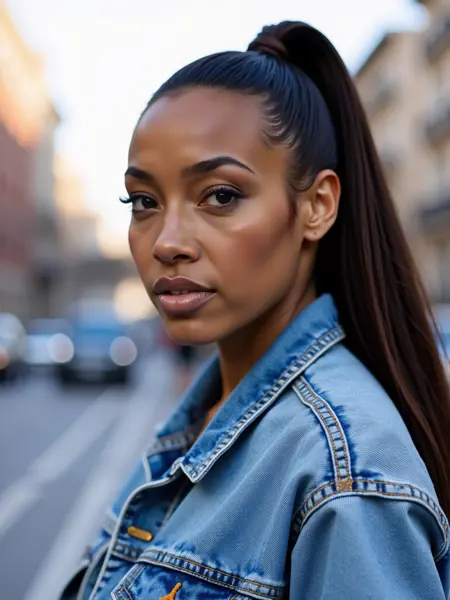 slicked back hairstyle:1.2, high ponytail:1.3, pulled back hairstyle:1.2
