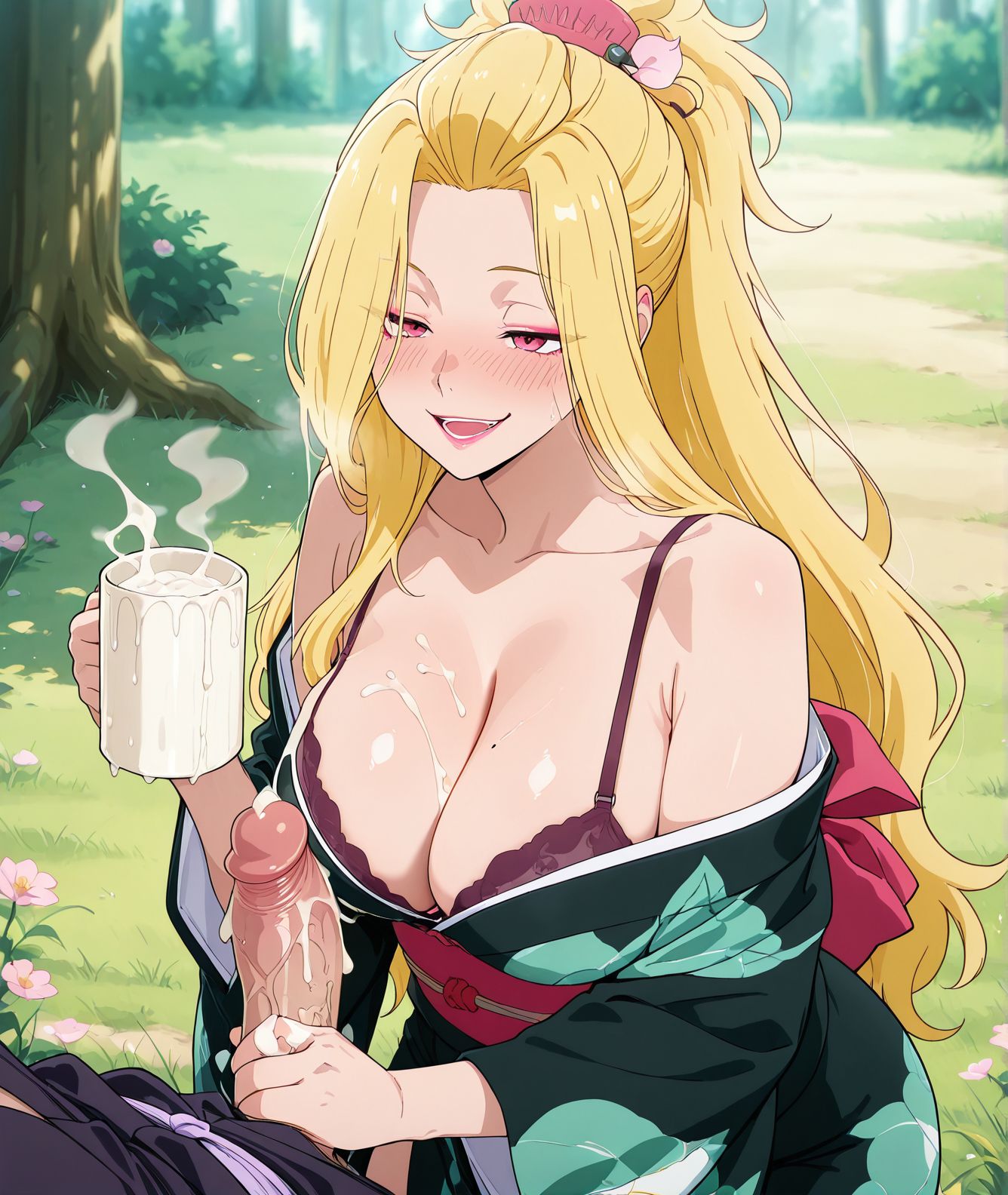 smirk, holding a mug, shooting cum in a mug,