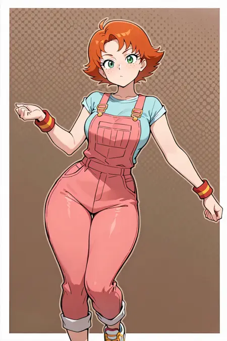 FrancesSX, 1girl, short orange hair, green eyes, freckles, pink overalls, light blue T-shirt, red-yellow wristbands, pink pants, white-red-yellow sneakers,