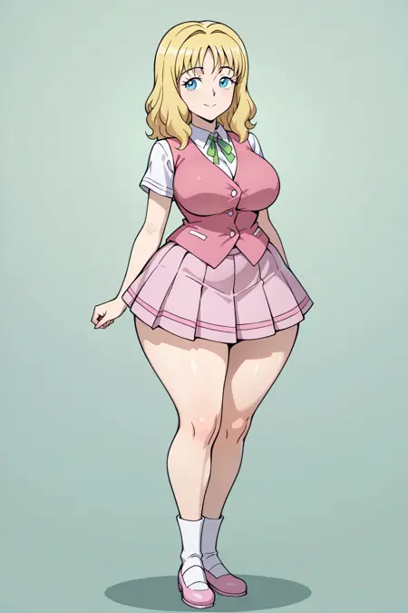 HelenSX, 1girl, blonde hair with bangs, bright blue eyes, green neck ribbon, pink vest, pleated pink skirt, white socks, pink mary janes, white shirt