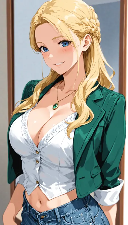 Fr3ya, blonde hair, long hair, french braid, blue eyes, smile, blush, large breasts, midriff, navel, soft skin, symmetrical face, anime style
