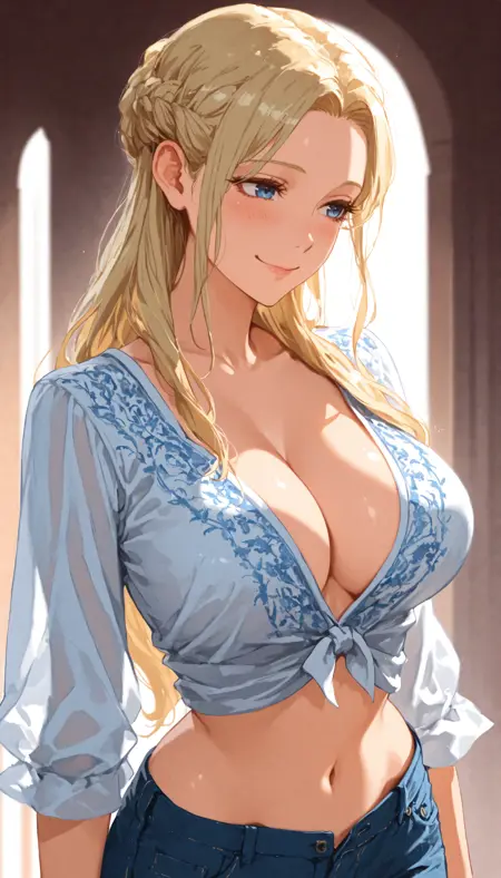 Fr3ya, blonde hair, long hair, french braid, blue eyes, smile, blush, large breasts, midriff, navel, soft skin, symmetrical face, anime style