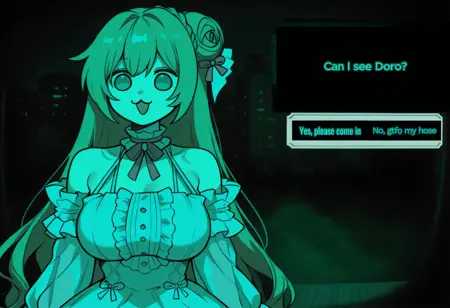 一款于2025年底发布的单人生存恐怖游戏,戏仿了门廊前鱼眼镜头近距离拍摄的可疑人物及对话选项场景。