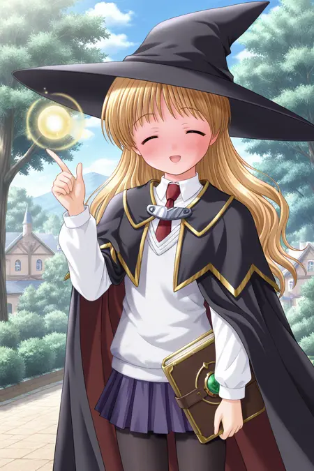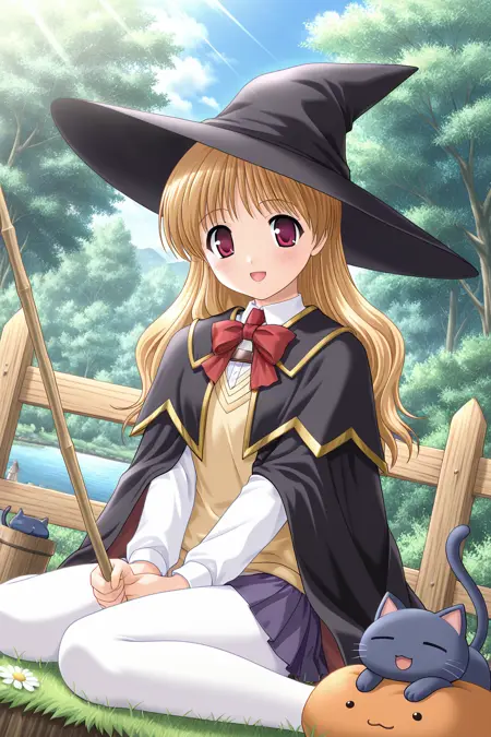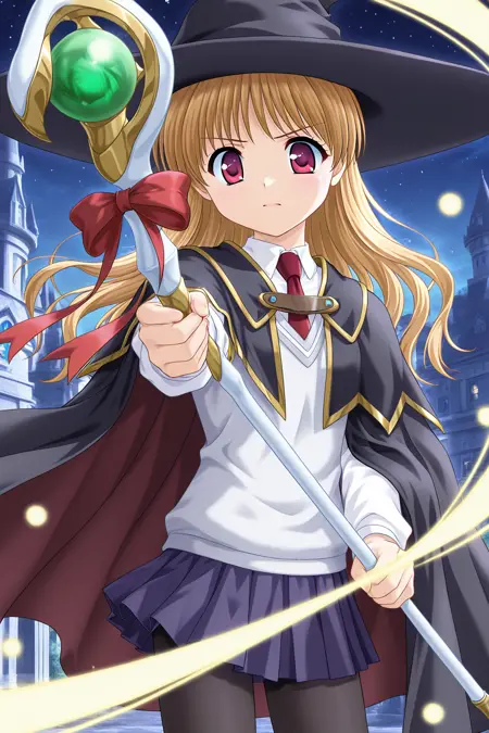 witch,witch hat,black headwear,cloak,black capelet,black cape,yellow sweater vest,red bowtie,white shirt,collared shirt,long sleeves,purple skirt,miniskirt,pleated skirt,white pantyhose,