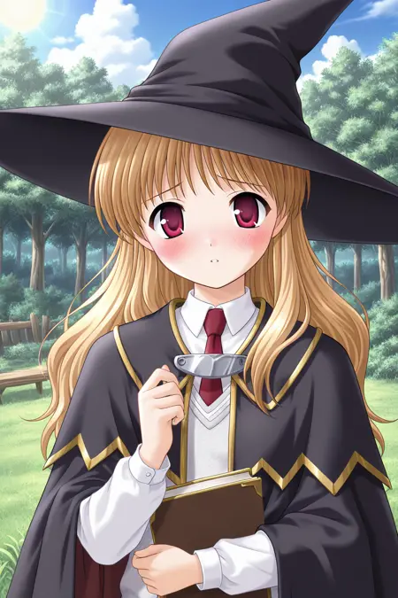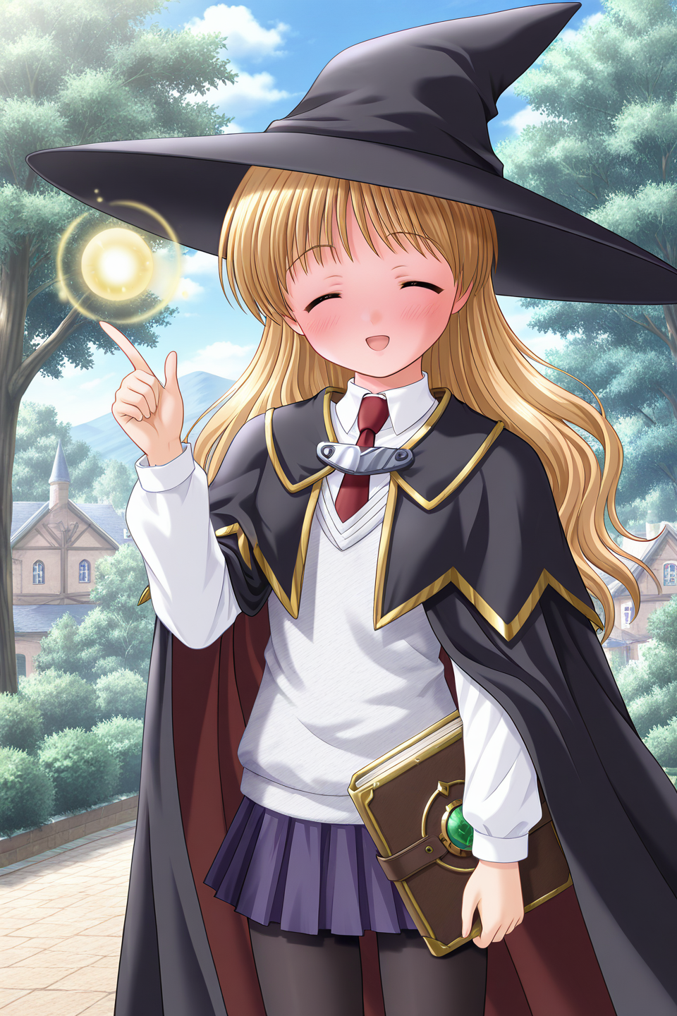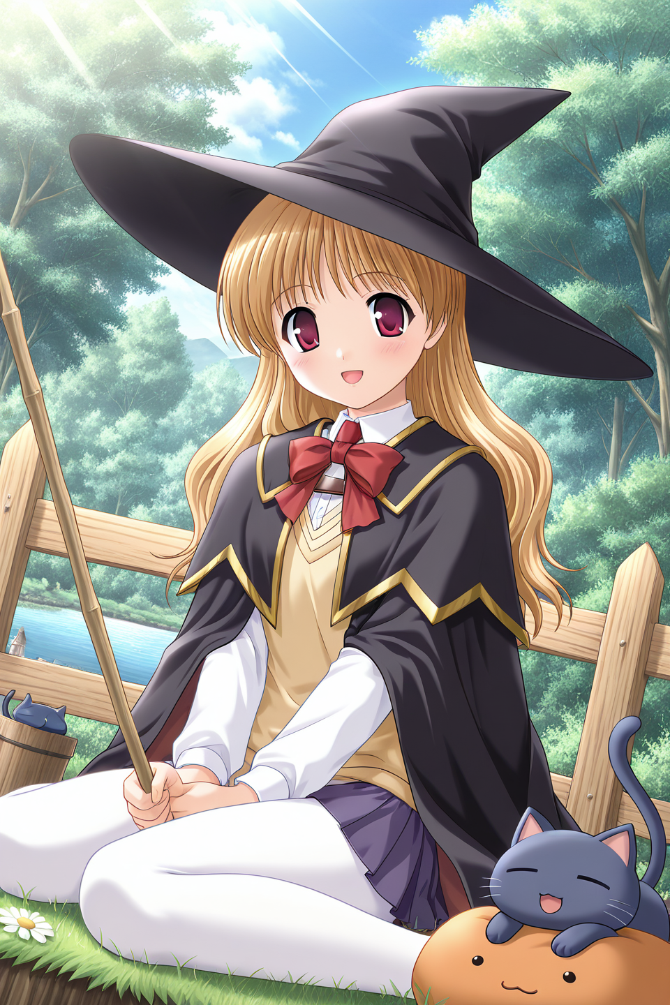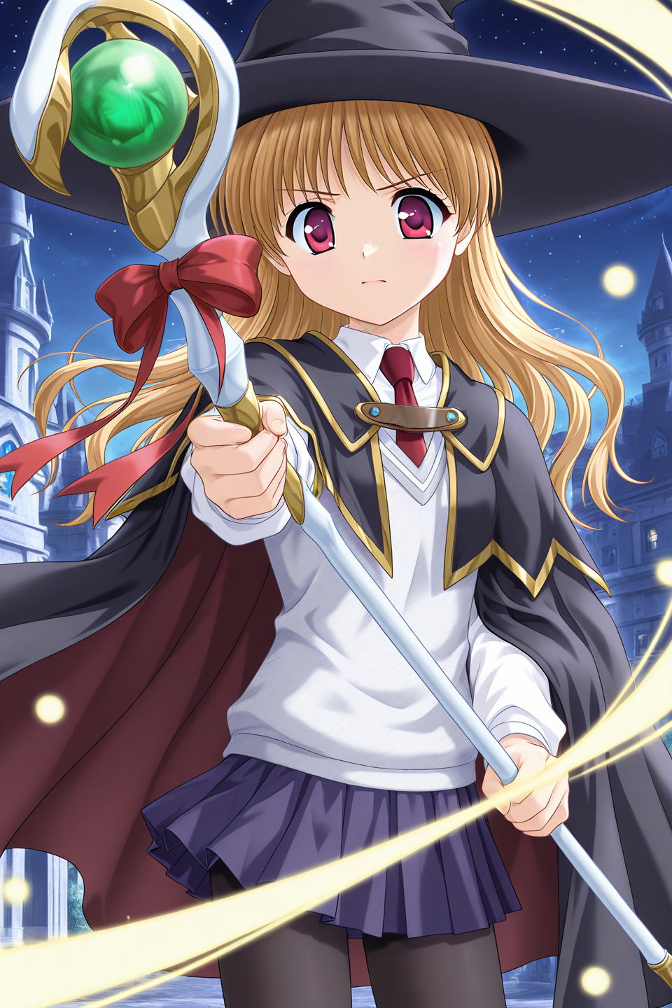 witch, witch hat, black headwear, cloak, black capelet, black cape, yellow sweater vest, red bowtie, white shirt, collared shirt, long sleeves, purple skirt, miniskirt, pleated skirt, white pantyhose,