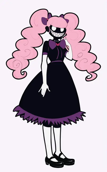 **Reinforcement Tags: colored skin, black skin, teeth, sharp teeth, smile, pink hair, white eyes, no pupils, twintails, long hair, curly hair, very long hair