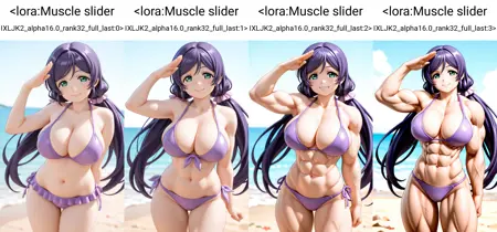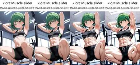 これはスライダー型LoRAです。ご希望のウェイトを自由に設定でき、試行錯誤して最適な値を見つけてください。正のウェイトは筋肉質な外見を追加します。8以上のようなより高いウェイトも使用できますが、キャラクターやチェックポイントによって適切な値は異なります。