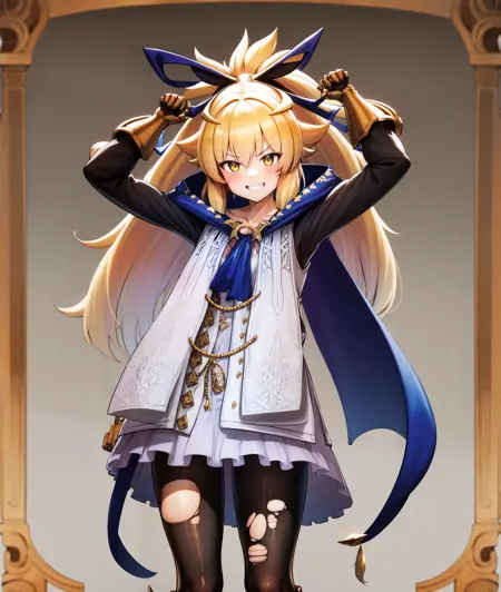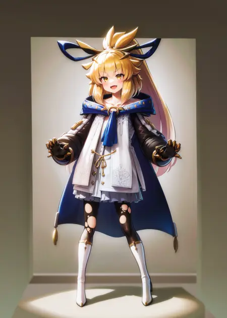 | 학습된 단어 | 1girl, solo focus, blonde hair, dress, white dress, long hair, ribbon, yellow eyes, fang, bangs, (hair ribbon:1.2),(blue ribbon),, hair between eyes, ponytail, torn clothes, (pantyhose:1.2), blue cape, long sleeves, hair ornament, frills, cloak, torn pantyhose, gloves, skin fang, frilled dress, black pantyhose, collarbone, blush, very long hair, cape, ascot, claws, high ponytail, hood, yellow ribbon, sidelocks, jewelry, blue ascot, sleeves past wrists, wide sleeves, , collared dress, blue cloak, claw (weapon), flat chest, coat, duel monster, ,gauntlets, 복사됨! |