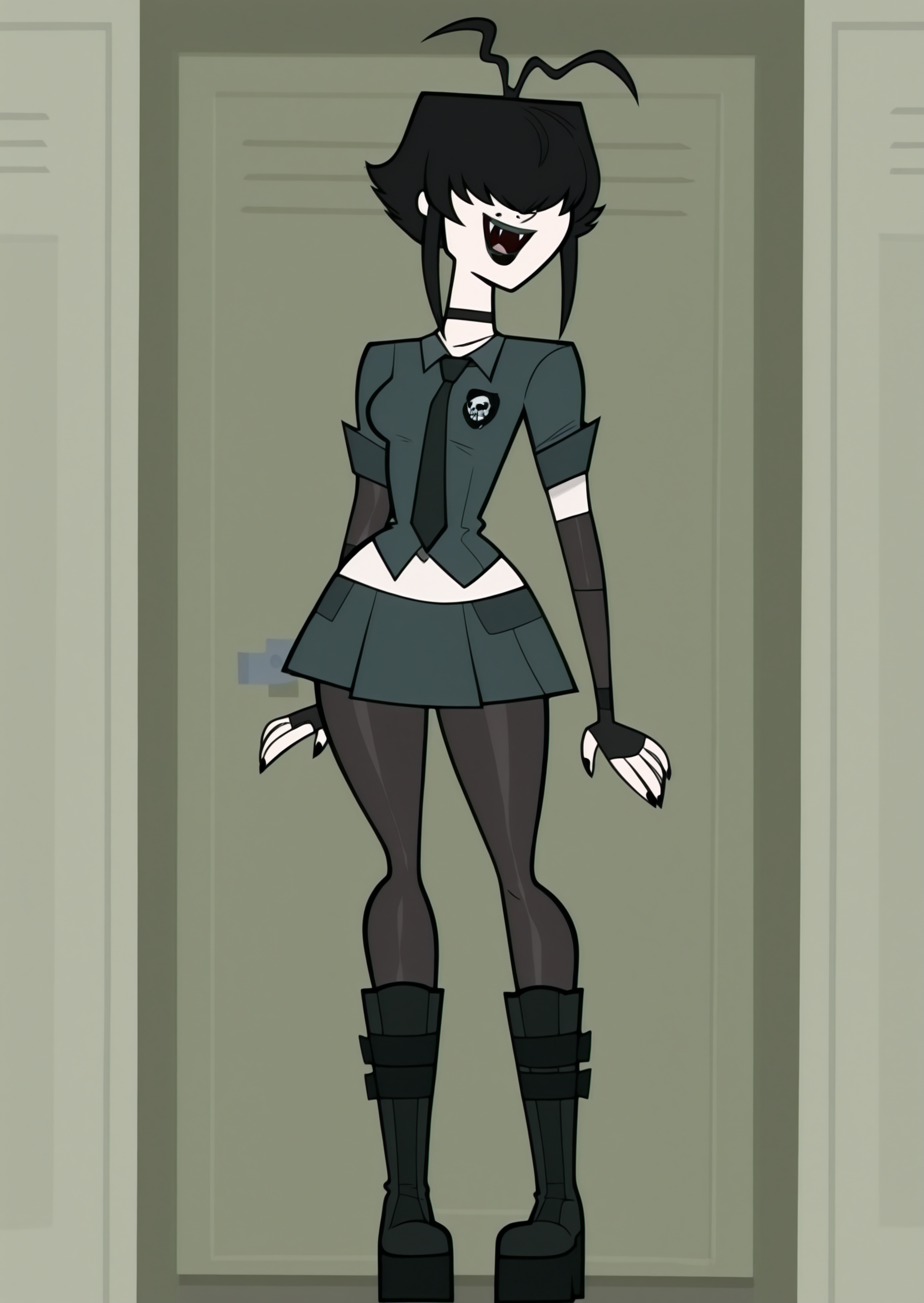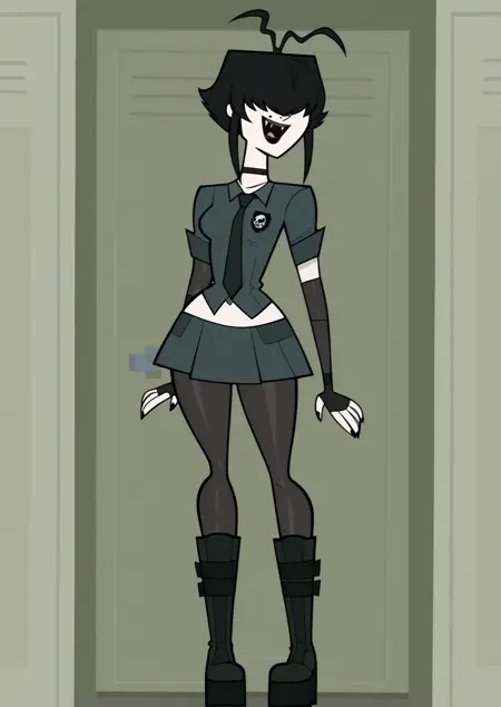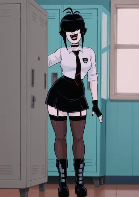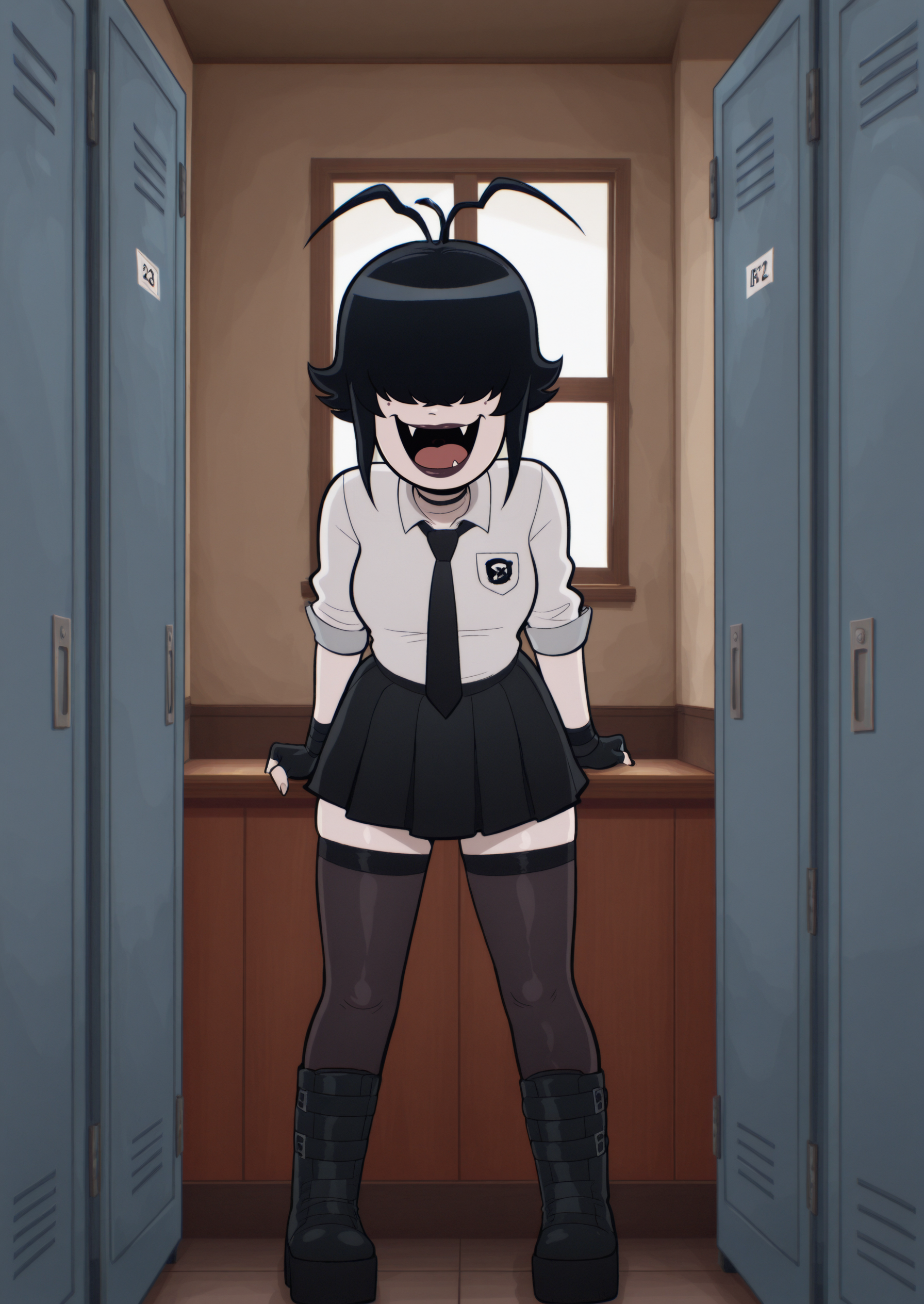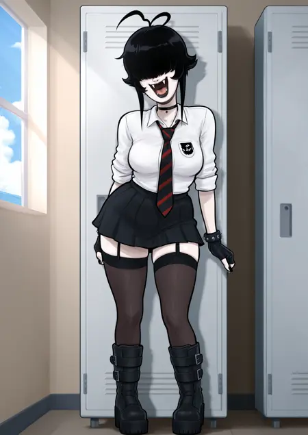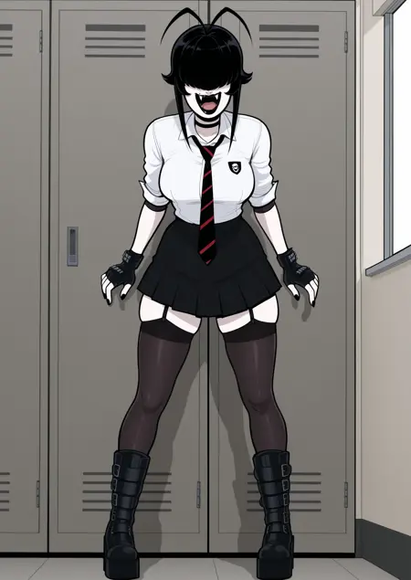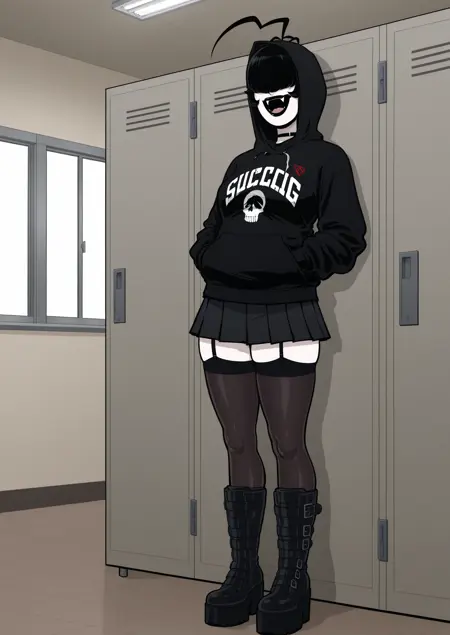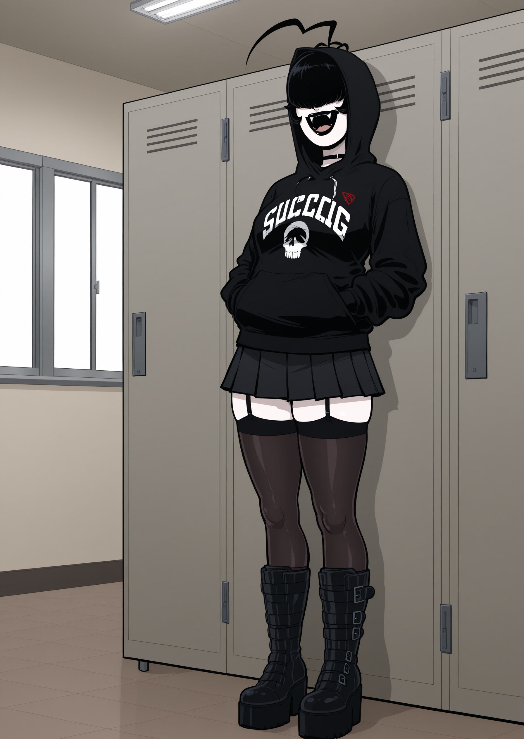 br1gid, black hair, pale skin, hair antenna, black lipstick, beauty mark, hair over eyes, bangs