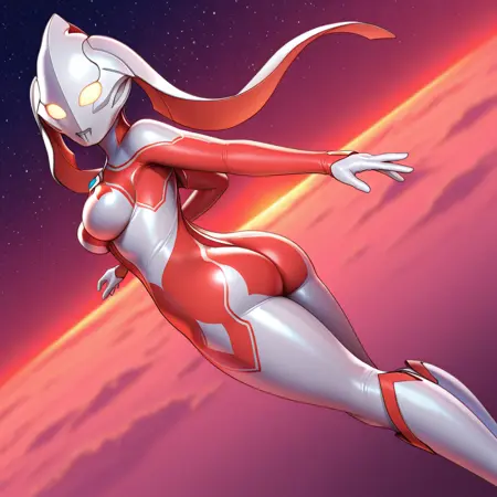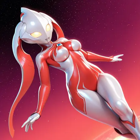 **prompt:**1girl, solo, tokusatsu, alien, twintails, mask, hedgear, blue chest jewel, colored skin, red and silver skin, white boots, breasts, hands on hips, boots, no pupils, medium breasts,full body, glowing, white eyes