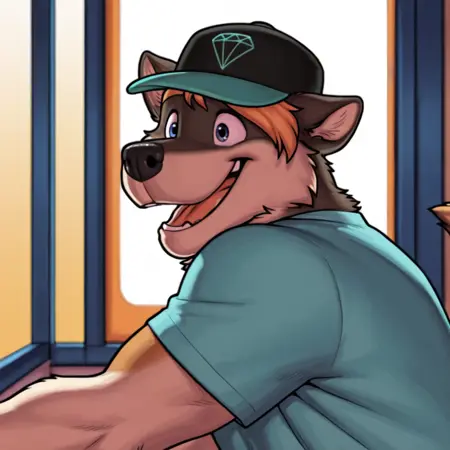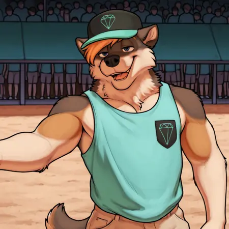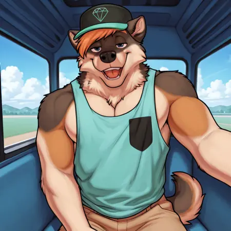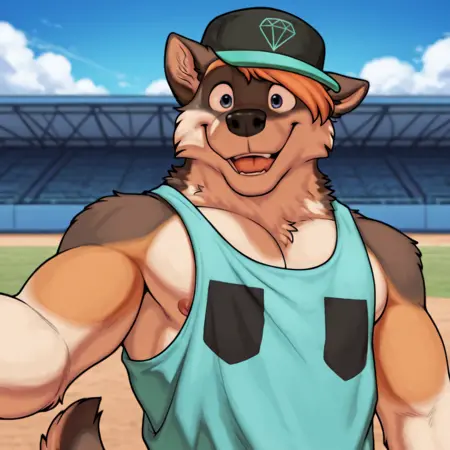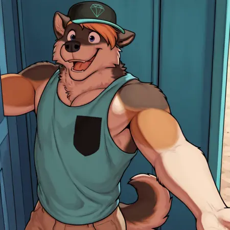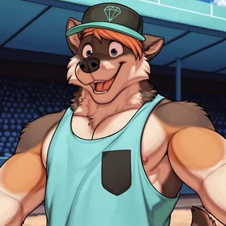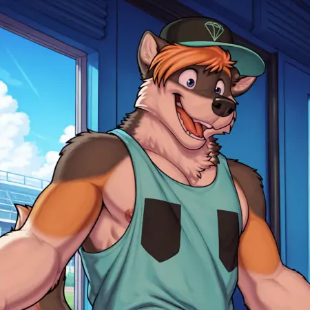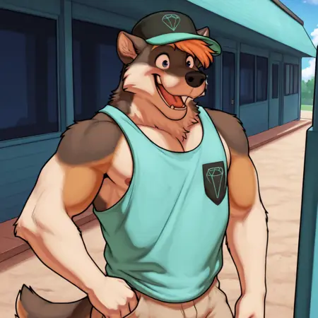 wolf, blonde_hair, muscular, blue_eyes, baseball cap