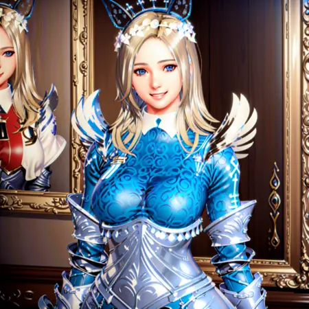 Outfit prompts: blue dress, armored dress, boots, armor, gauntlets, greaves, skirt, white skirt, pantyhose