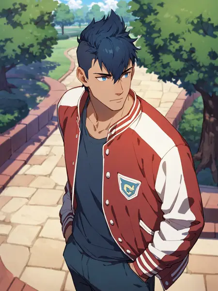 蓝色夹克,黑色衬衫,黑色裤子,手镯,